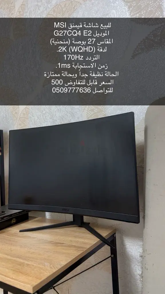 I'm selling my MSI 27" G27CQ4 E2 curved monitor. I bought it about 1–2 years ago and it's in excellent condition with light usage only. The panel is 27 inches (VA) with WQHD 2560x1440 resolution, 170Hz refresh rate and 1ms response time, so it's smooth for gaming and daily use. No warranty remains. Comes with the stand shown; cables and original box not guaranteed. Selling because I no longer need a secondary monitor. Price is negotiable — contact me to arrange viewing.