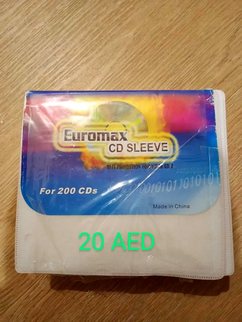 I'm selling a pack of Euromax CD sleeves that holds up to 200 CDs. I bought these a couple of years ago and they've been stored in a drawer, so they're in good condition with only light usage. The sleeves are the standard paper/plastic combination with clear front pockets and a fabric backing — suitable for organizing and protecting discs without jewel cases. The pack is still wrapped in plastic but shows minor shelf wear on the outer packaging. Price: 20 AED.