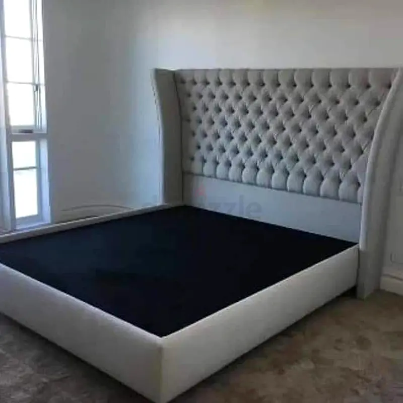 - Type: Upholstered bed frame with tall tufted wingback headboard