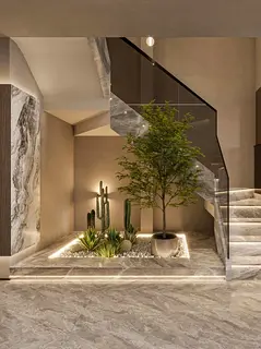 نقوم بتحضير جميع الخامات على حسب ذوق العميل واستغلال المساحة المهدرة اسفل السلم أو الدرج وتزيينه بالليد والاحجار والزهور كذلك نستطيع تنسيق الحدائق وتركيب الشلالات والمظلات والعشب